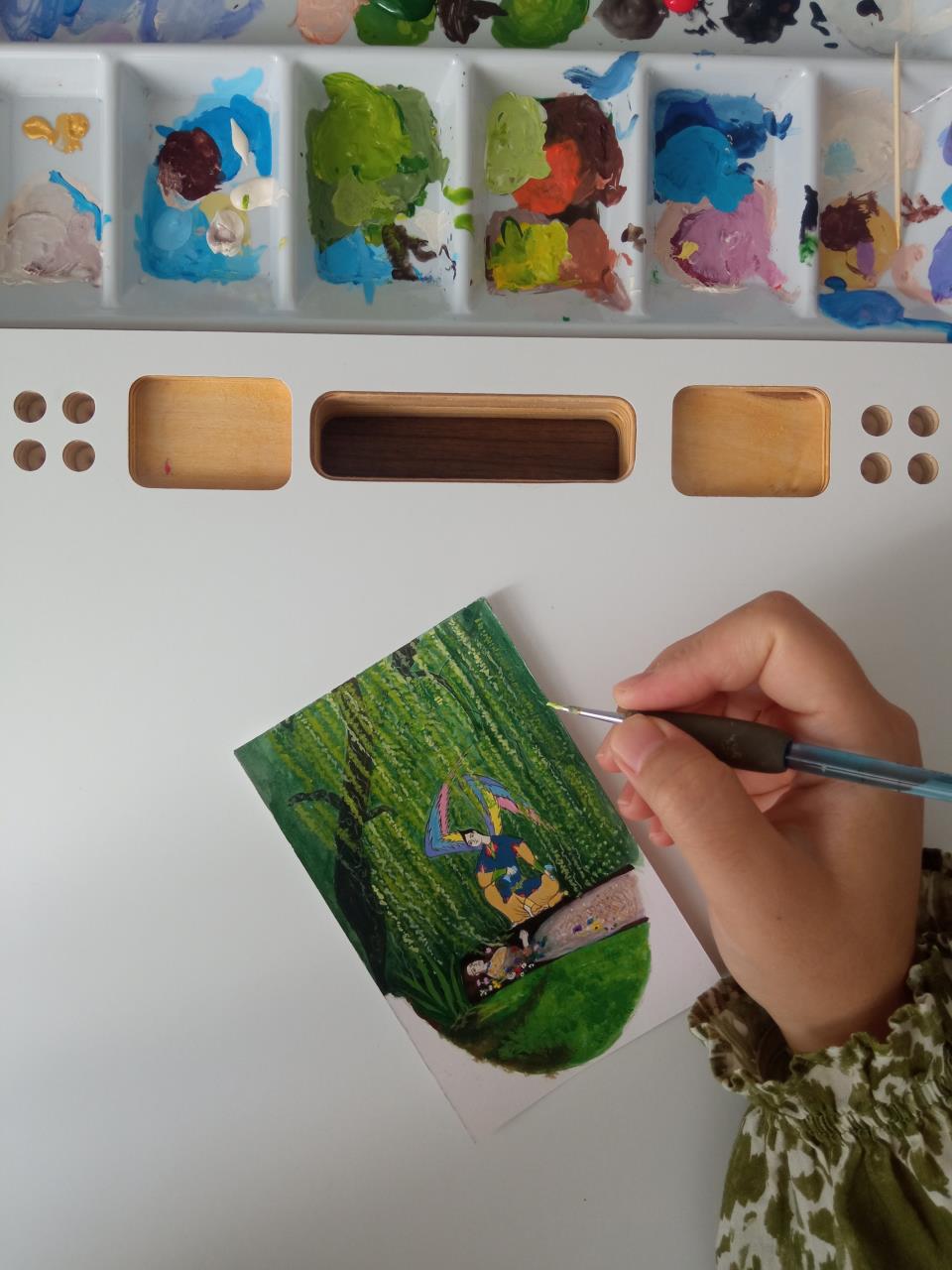 Akrilik boya, 300 gr dokulu kağıt üzerine, 24x18 cm ölçüsünde özel kesim sanat kağıdı kullanılmıştır.