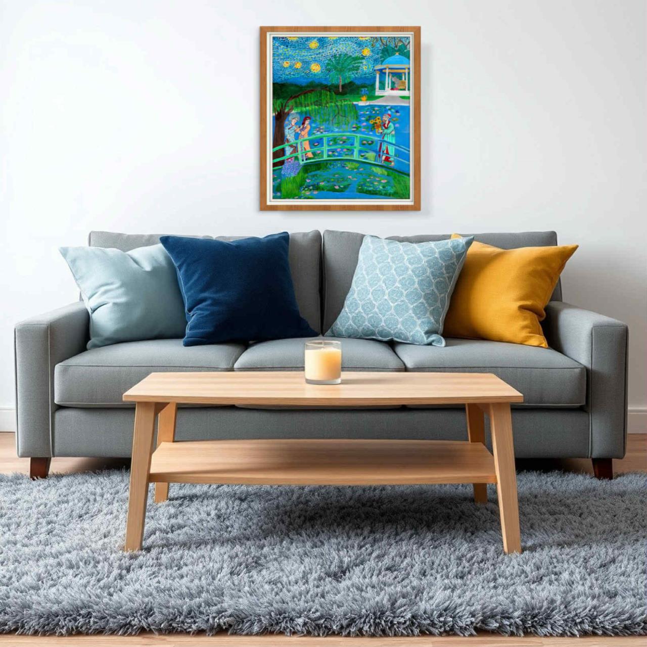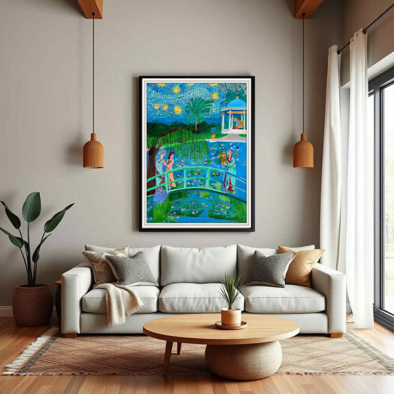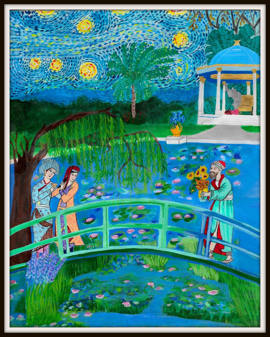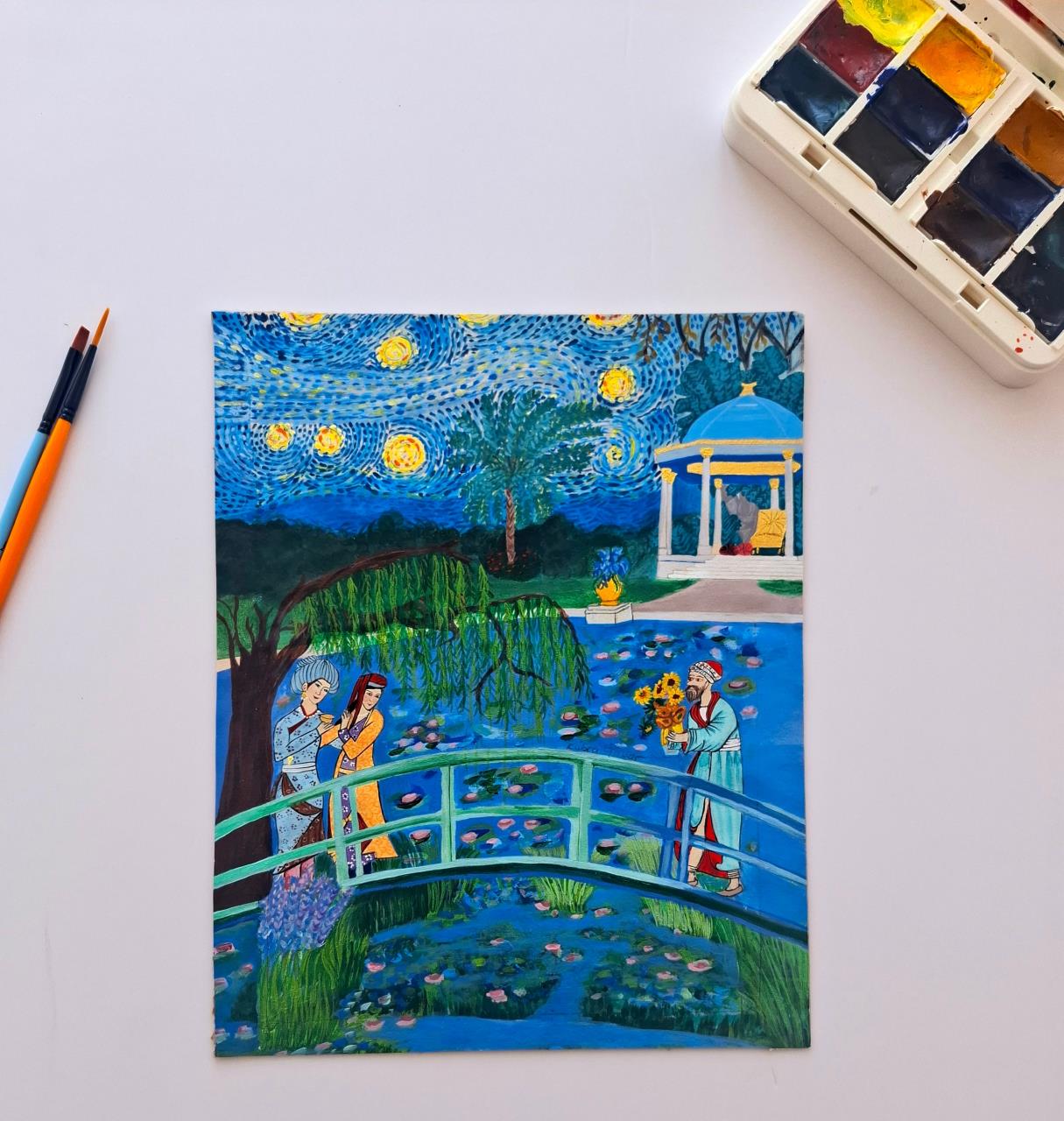 Bu sahneyi çizerken tam anlamıyla Beyaz Geceler romanındaki final sahnesinden esinlendim. Ve Monet’in Nilüfer Gölü eserinin içinde yerleştirdim figürlerimi. Van Gogh’un Yıldızlı Gece sinde Nilifer Gölünün üzerine kapanan köprüde hayat verdim bu sahneye.
