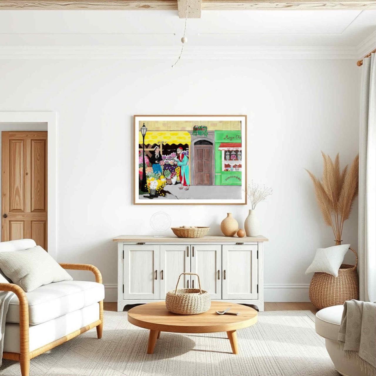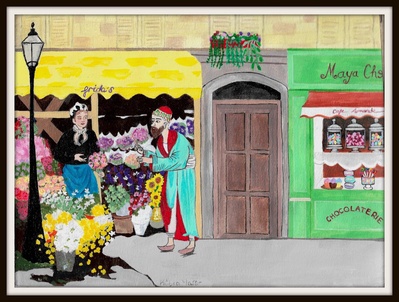 Bu çizim Rakım’ın kalbindeki en taze duyguların ilk kıvılcımını taşıyor. Taze bir heyecan içinde bu heyecanın sebebi olan kadınla, yani Müjgan’la tanışmak için bu rengarenk çiçekçide ona çiçek seçiyor. Sarının, morun, pembenin ve kırmızının farklı tonlarındaki bu çiçekler, aşkın çeşitli hallerini, duyguların zenginliğini simgeliyor. Rakım’ın ellerindeki çiçekler, henüz kelimelere dökülemeyen hislerin sessiz anlatımı gibi.