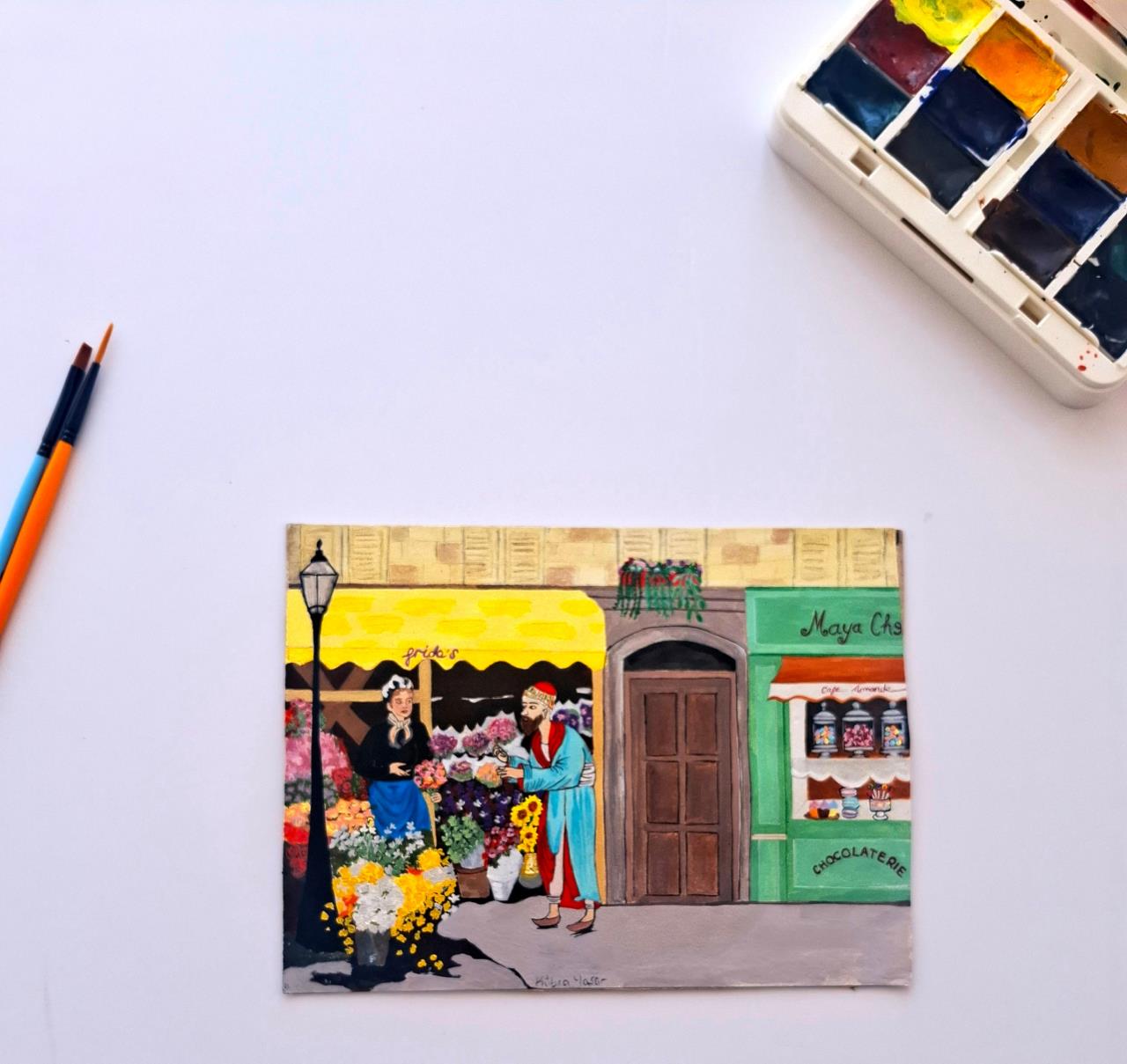 Sokak lambası ise benim için Beyaz Geceler romanındaki atmosferi hatırlatıyor. Lambanın varlığı, geçmişten gelen anıların ve duyguların hafif bir gölgesi gibi, geçmişle bugünün arasındaki ince bağı simgeliyor. Yan köşede yer alan çikolata dükkanı ise, “Çikolata” filminden ilham alınarak eklenmiş, tatlı ve sıcak bir dokunuş. O tatlı anlar, küçük umutlar ve yeni başlayan sohbetler gibi Rakım’ın hislerine eşlik ediyor.