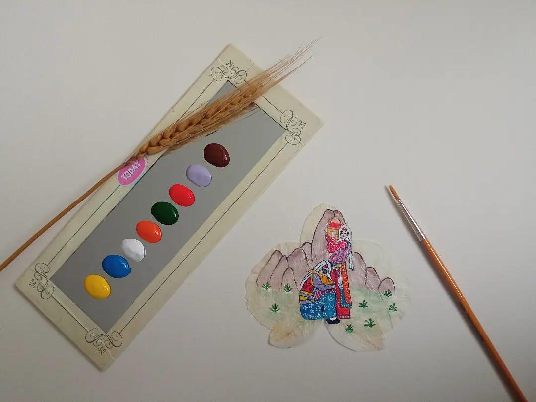 Akrilik boya ile kurutulmuş orkide çiçeği üzerine çizilmiştir.
